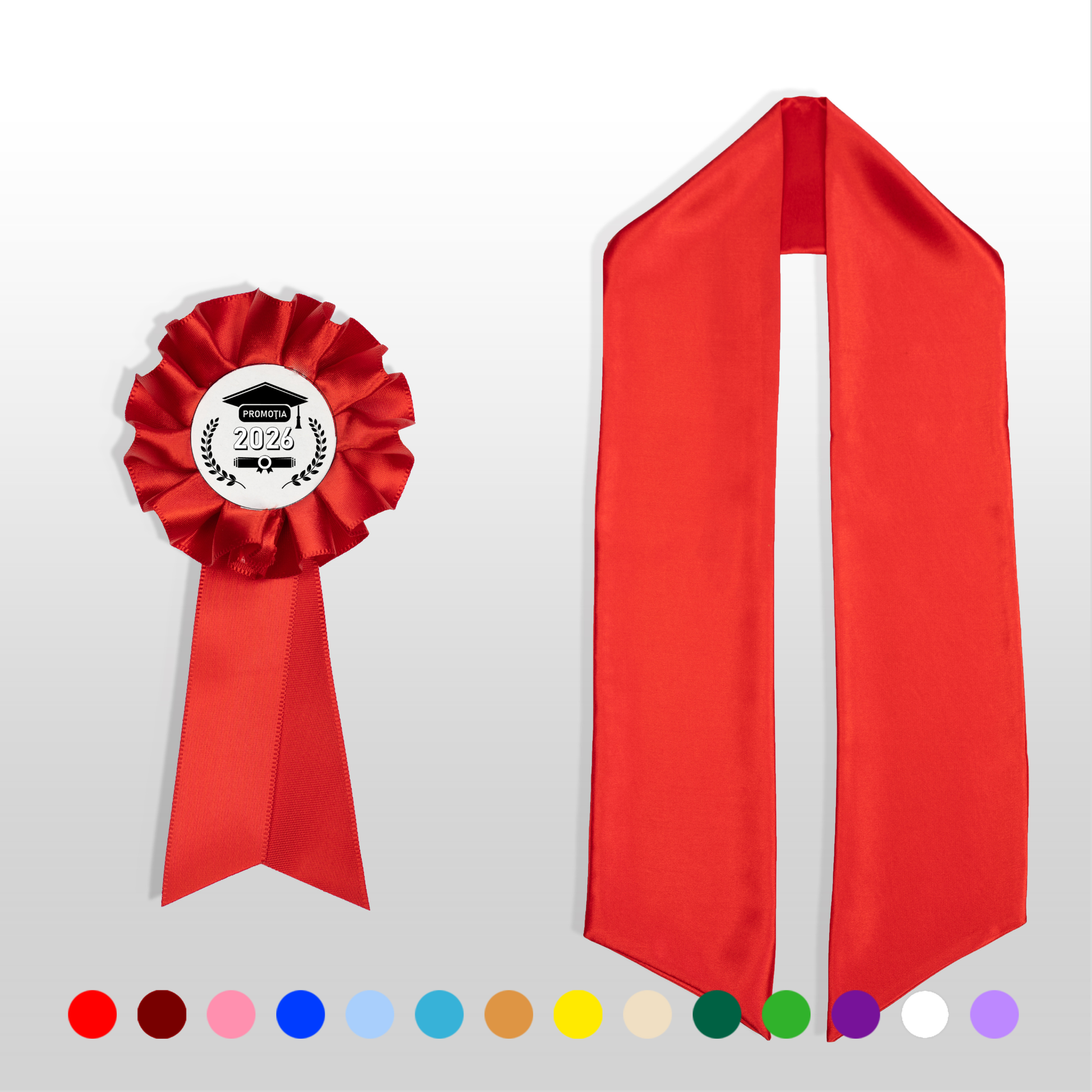 Personalizare standard (eșarfă cu promoția): Eșarfa poate fi personalizată cu un design standard, care include un text dedicat promoției, precum „Promoția 2026”. Acest detaliu adaugă o notă de originalitate și distincție.